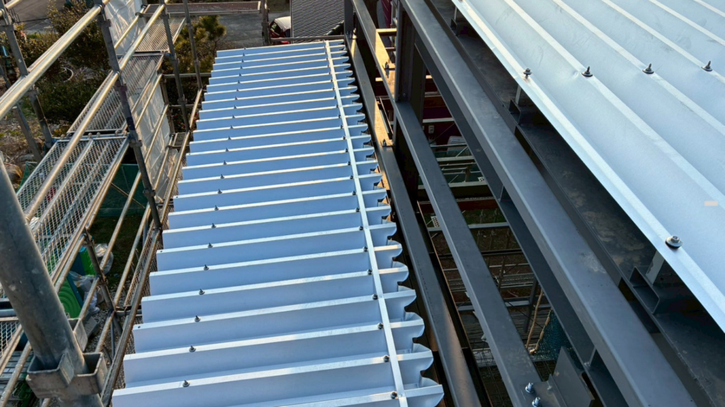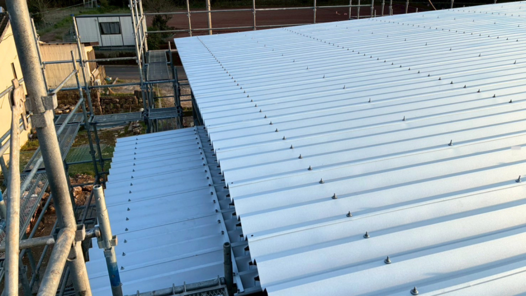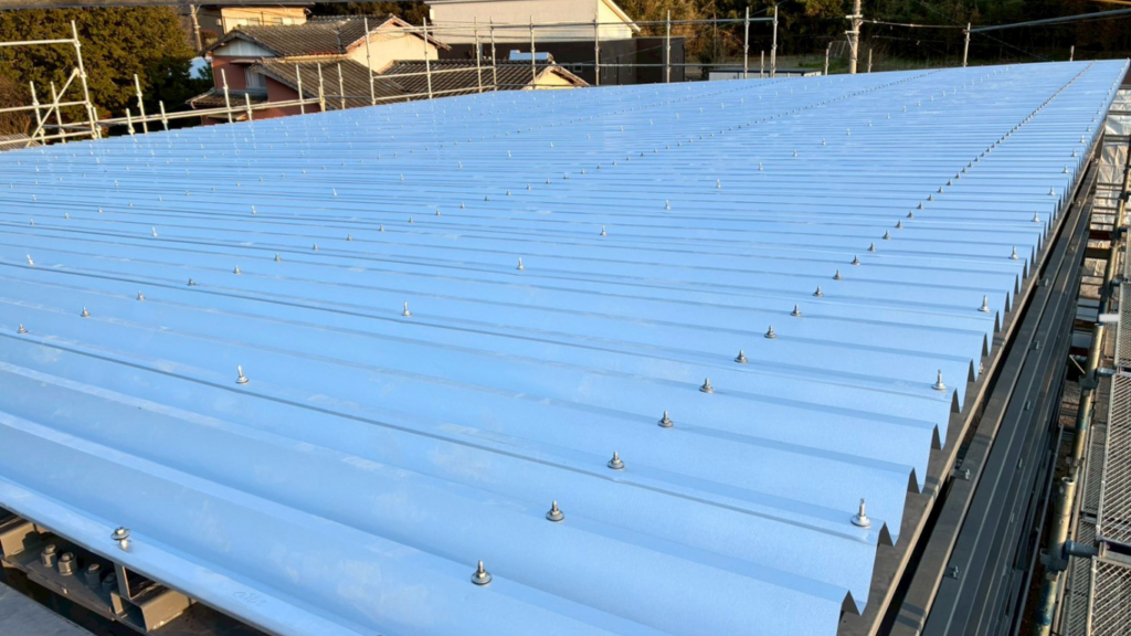 鉄骨造の倉庫で板金屋根の施工が行われ、